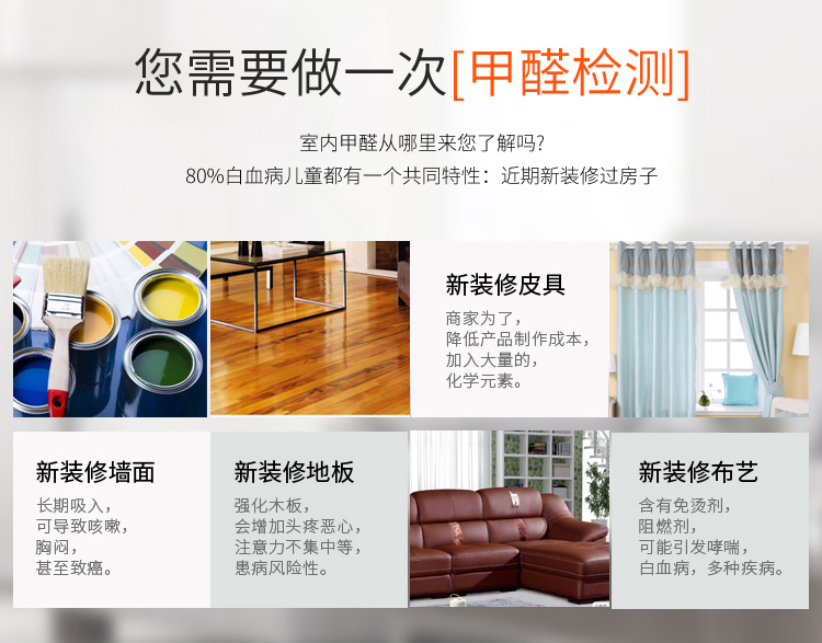 從上圖我們可以看到裝修幾乎使用的所有材料都含有甲醛,且危害極大,因而在入駐以前對室內空氣進行檢測以確保合格再入住很有必要。